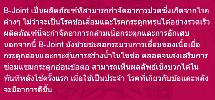 ในบทความนี้ คุณจะได้รู้ว่า คือ อะไร, ดีไหม B-Joint, วิธีทาน, วิธี ใช้ ยา B-Joint และ วิธีใช้ยา รวมทั้งที่ ซื้อ และ ราคาเท่าไร ในประเทศไทย อ่าน รีวิว เกี่ยวกับ B-Joint ในฟอรัมพันทิป