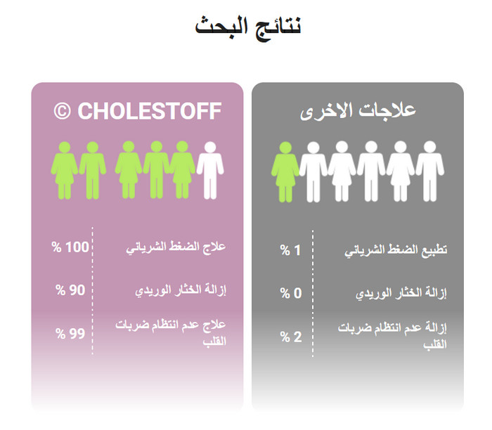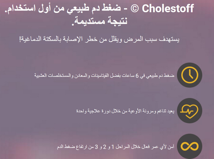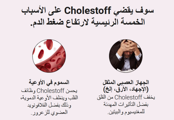 ذو تأثيرات معقدة CholestOff يخفض ضغط الدم إلى مستوياته الطبيعية. بفضل تركيبته الطبيعية فهو آمن وغير ضار للجسم.