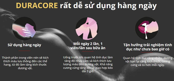 Sau khi dùng một sản phẩm Duracore tác dụng kéo dài trong 3 ngày. Tất cả thời gian này, một người đàn ông có thể quan hệ tình dục mà không phải lo lắng về kích thước, thời gian và chất lượng của tình dục.