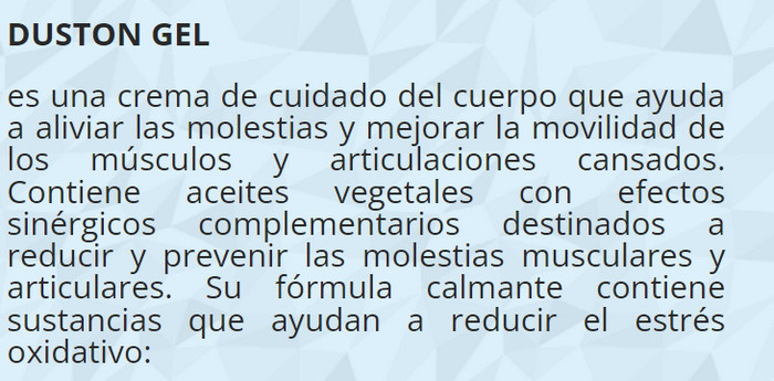 Duston gel elaborado únicamente a partir de sustancias naturales. El ingrediente principal de la cremaDuston gel es un complejo de condroitina y glucosamina. La composición activa, compleja y natural de la crema durante la terapia produce los siguientes efectos:
