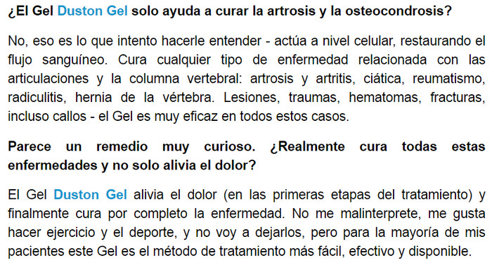 ¡Date libertad de movimiento! Cuide la salud de sus articulaciones hoy. Todo lo que necesita hacer para esto es comprar una crema Duston Gel y usar el producto de acuerdo con las instrucciones.