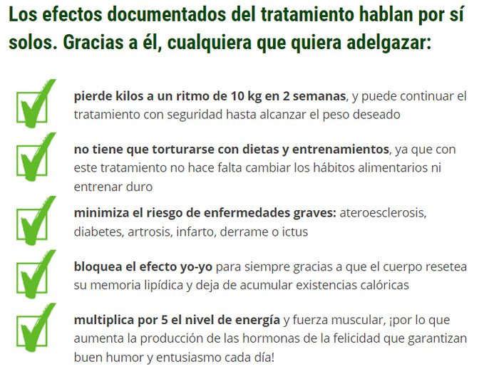 Por lo tanto, la pérdida de peso con este medicamento ocurre de la manera más segura posible, sin estrés para el cuerpo, un ataque de nervios. El medicamento no tiene ningún impacto negativo en el funcionamiento de los órganos internos, sino que solo ayuda a hacer frente a las patologías del corazón, el hígado, etc.