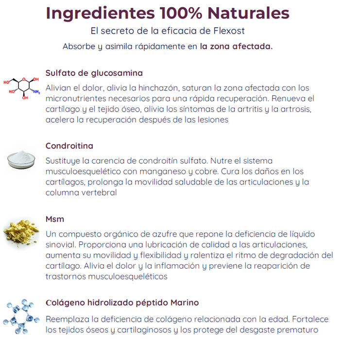 El motivo del uso de cápsulas naturales Flexost puede ser diversas lesiones, cambios propios de la edad, cirugías previas, etc. En este artículo puede leer sobre qué es Flexost, cómo funciona el producto, cuáles son sus ventajas sobre los análogos en Peru, cómo usar el producto de acuerdo con las instrucciones de uso, donde comprar Flexost, donde la venden y cuál es su precio. Lea también testimonios, comentarios y opiniones sobre Flexost en foro.
