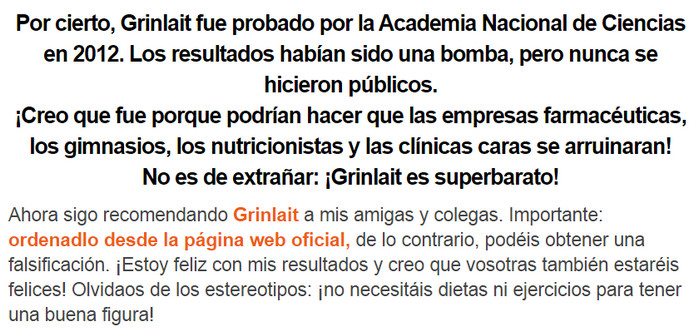 Es mucho más fácil ganar kilos de más que deshacerse de ellos más tarde. Las huelgas de hambre, las populares “dietas estrella” y los quemagrasas popularizados afectan negativamente la salud, pero no resuelven el problema. Una excelente alternativa para quienes quieran desprenderse de la obesidad excesiva y los complejos será Grinlait. Esta herramienta es reconocida como un verdadero avance en la lucha por la armonía. No tienes que romper tu estilo de vida, deshacerte de los hábitos alimenticios o torturarte en el gimnasio. ¡La fórmula innovadora hará todo por ti! Los kilogramos desaparecerán de forma natural y el proceso de adelgazamiento será cómodo.