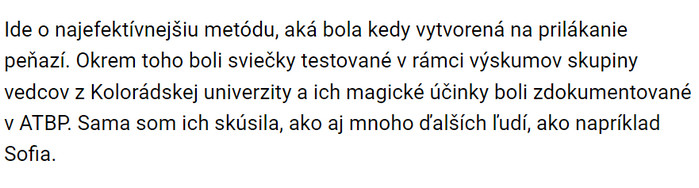 Od staroveku sa ľudia snažia prilákať prosperitu a bohatstvo pomocou rôznych magických rituálov, amuletov, sprisahaní a sviečok pre šťastie a peniaze sa nestali výnimkou. Všetci kúzelníci, psychici, liečitelia s istotou hovoria, že správne vybraná alebo vlastnoručne vyrobená sviečka môže priniesť šťastie a prosperitu. Nie všetky však fungujú a je lepšie si vybrať taký, ktorého účinnosť potvrdzujú recenzie, komentáre, diskusia a skúsenosti zákazníkov z celého sveta na forum.