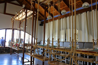 En la entrada tienen la barra de servicio y desde ella da entrada a los dos amplios salones, uno un salón comedor con mesas bajas y en la parte central mesas altas con asientos que son columpios que le dan un toque informal y particular. El otro salón con sogas y mesas bajas, dedicados más a copas y cocteles, además de tener un pequeño escenario para actuaciones en directo.