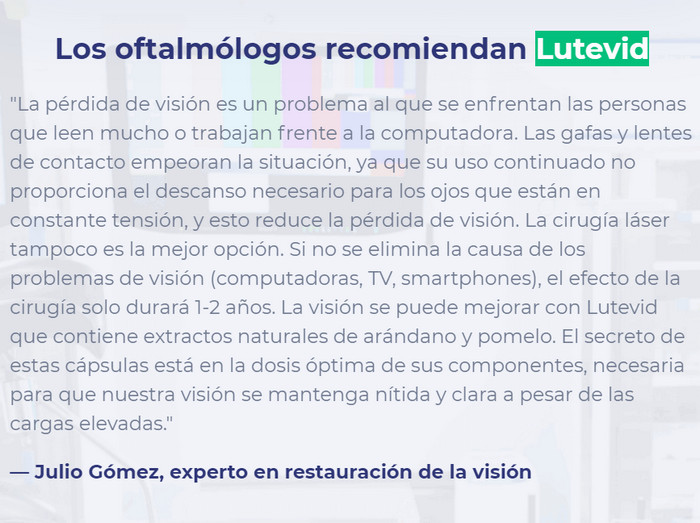 Lutevid acaba de salir a la venta, pero ya ha logrado ganarse la simpatía de los consumidores. Entre los médicos, la herramienta recibió una aprobación no menos sincera. Los oculistas apreciaron merecidamente sus capacidades, ayudando a neutralizar tanto las desviaciones menores como los problemas graves. No es necesario esperar a la etapa en la que comienzan a desarrollarse amenazas aterradoras; ¡es mejor cuidar de proteger el aparato visual en los próximos días! Contiene solo ingredientes y componentes naturales.