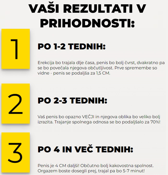 - Po 4-5 tednih nanosa izdelka na pen, po navodilih za uporabo: dolžina pena se poveča na 18 centimetrov, njegov obseg pa približno 4 centimetre. Trajanje spolnega odnosa je približno 2 uri, konča pa se z zelo močnim orgazmom