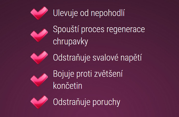 - Urychluje lokální průtok krve a dodávání prospěšných prvků do kloubu