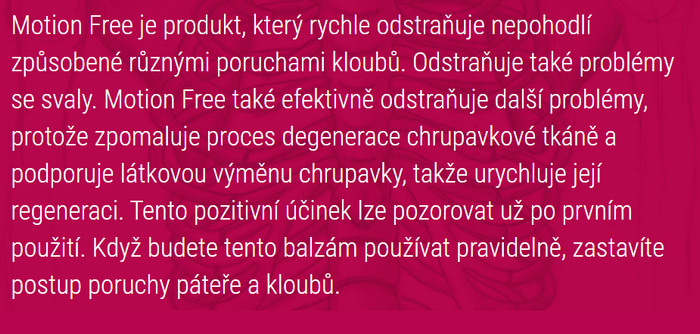 Kloubní onemocnění jsou podle posledních statistik v prevalenci na třetím místě. A to znamená, že právě teď miliony lidí po celé planetě hledají, kde koupit lék, který kloubům poskytne alespoň tu nejmenší úlevu od bolesti a ztuhlosti. Lékaři však nedávají plnou záruku, zda vám ten či onen lék pomůže. Výrobci gelu s názvem Motion Free jsou však přesvědčeni, že jejich bezpříkladný vývoj bude vynikající náhradou za dlouhou a neúčinnou léčbu, včetně chirurgického zákroku. Podle tvůrců léku obnovuje tkáň chrupavky a zastavuje zánět. Údajně také odstraňuje soli, zmírňuje bolesti a účinně léčí nejrůznější kloubní onemocnění.
