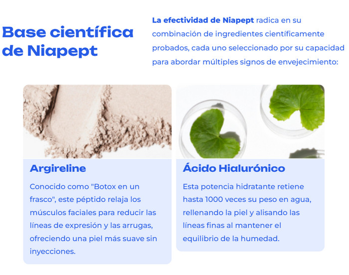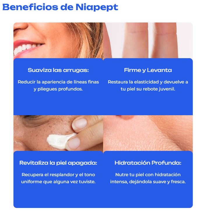 A continuación, se enumeran los componentes principales de la crema Niapept y sus posibles beneficios para la piel: