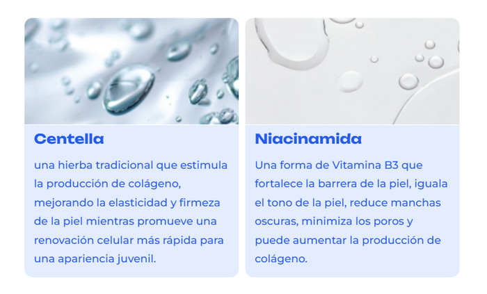 - Estimulación del colágeno (Centella): La Centella puede ayudar a estimular la producción de colágeno, que juega un papel clave en el mantenimiento de la firmeza y elasticidad de la piel. Al acelerar la renovación celular, este componente puede contribuir a restaurar el aspecto juvenil de la piel y mejorar su estructura