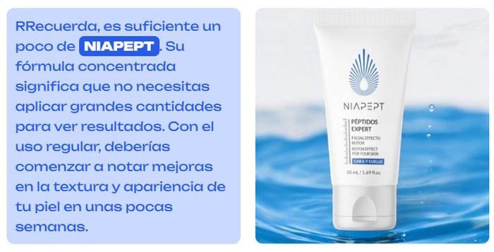 Como ocurre con cualquier producto cosmético, el efecto puede variar según las características individuales de la piel. Sin embargo, en general, Niapept recibe altas calificaciones por su eficacia y su enfoque integral para combatir los signos del envejecimiento.