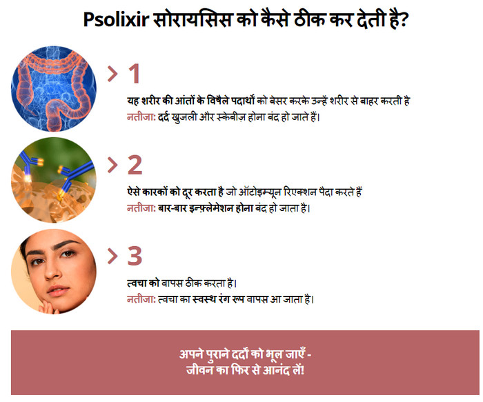 सोरायसिस के लक्षणों और इसके दिखने वाले लक्षणों को खत्म करने के लिए एक अत्यधिक प्रभावी उपाय Psolixir Cream सबसे अच्छा विकल्प है। यह त्वचा की मूल संरचना को पुनर्स्थापित करता है और इसे सोरियाटिक लक्षणों की पुनरावृत्ति से बचाता है। त्वचा नरम, मखमली और स्पर्श के लिए सुखद हो जाती है।