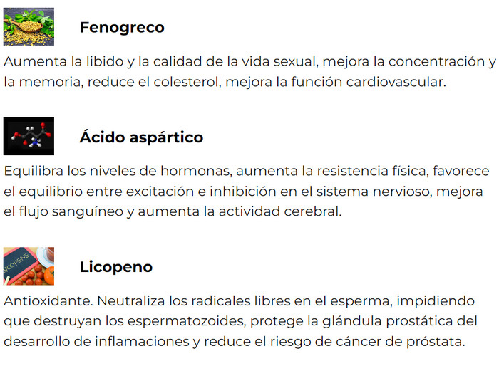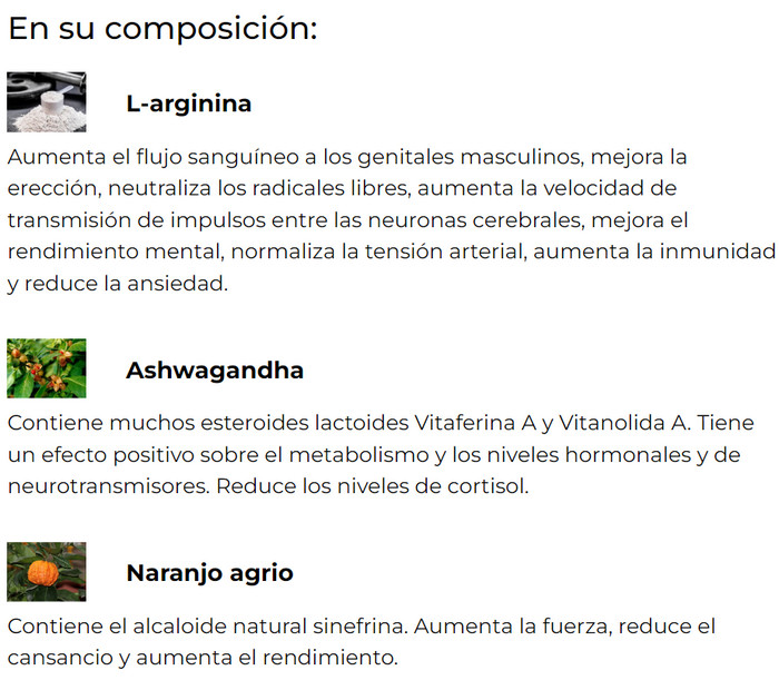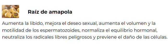 - Aumenta la libido, agiliza la producción de orina, elimina la eyaculación precoz