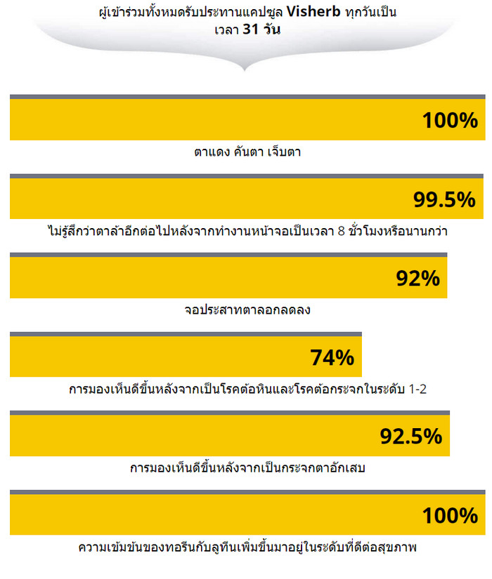แคปซูล Visherb – ส่วนผสมของสารออกฤทธิ์เพื่อรักษาความคมชัดของภาพ Visherb ดูดซับรังสีแสงที่เป็นอันตราย (ส่วนสีน้ำเงินของสเปกตรัม) และในขณะเดียวกันก็ทำให้ผลเสียหายของอนุมูลอิสระเป็นกลาง ลูทีนสองการกระทำนี้ช่วยป้องกันการทำลายจอประสาทตา เหมาะอย่างยิ่งสำหรับการรักษาความเข้มข้นของลูทีนที่ต้องการในจุดภาพชัด
